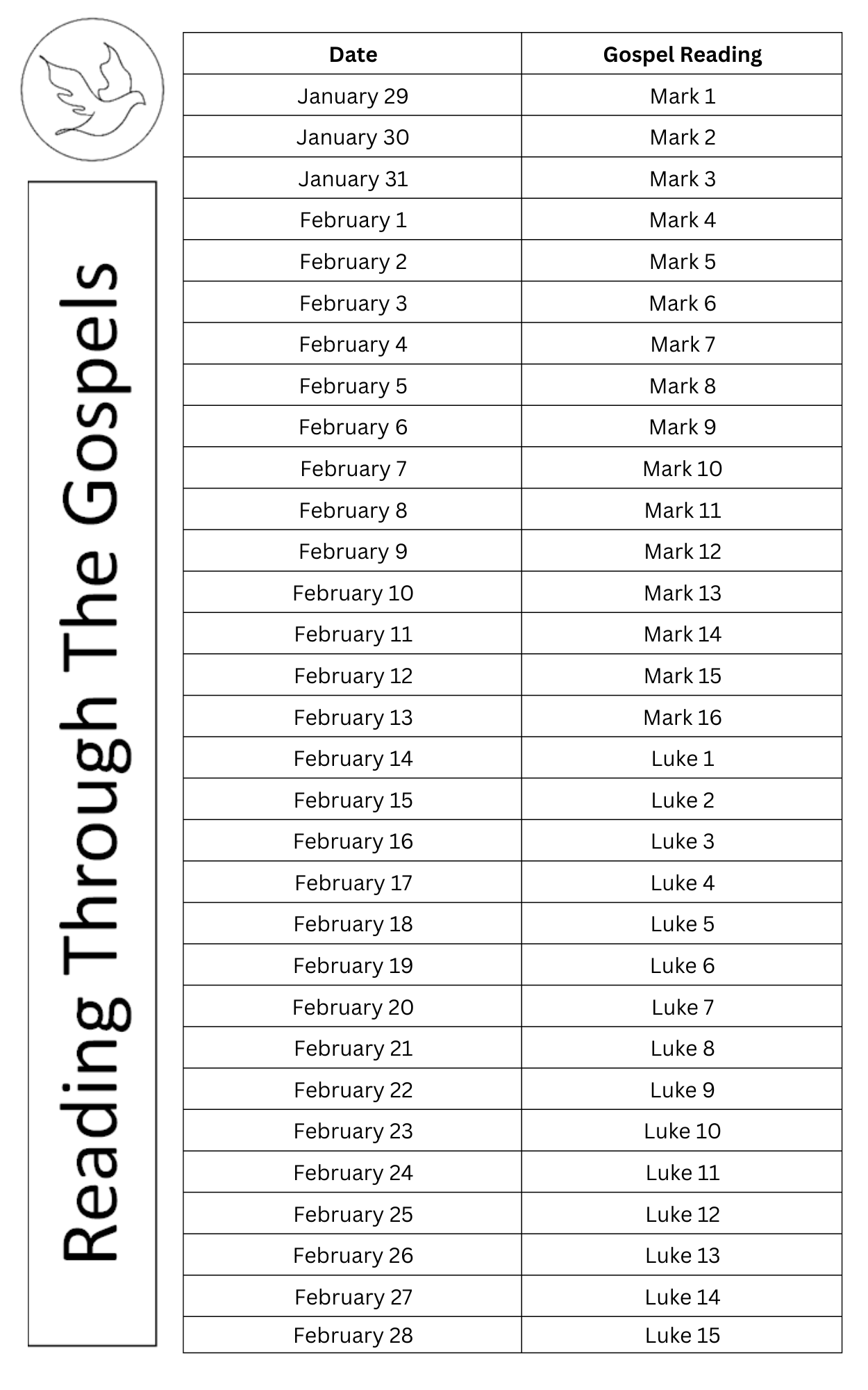 To begin 2026, we are reading through the Gospels as a congregation. We will read one chapter of a gospel book each day. We are currently in the book of Mark.
