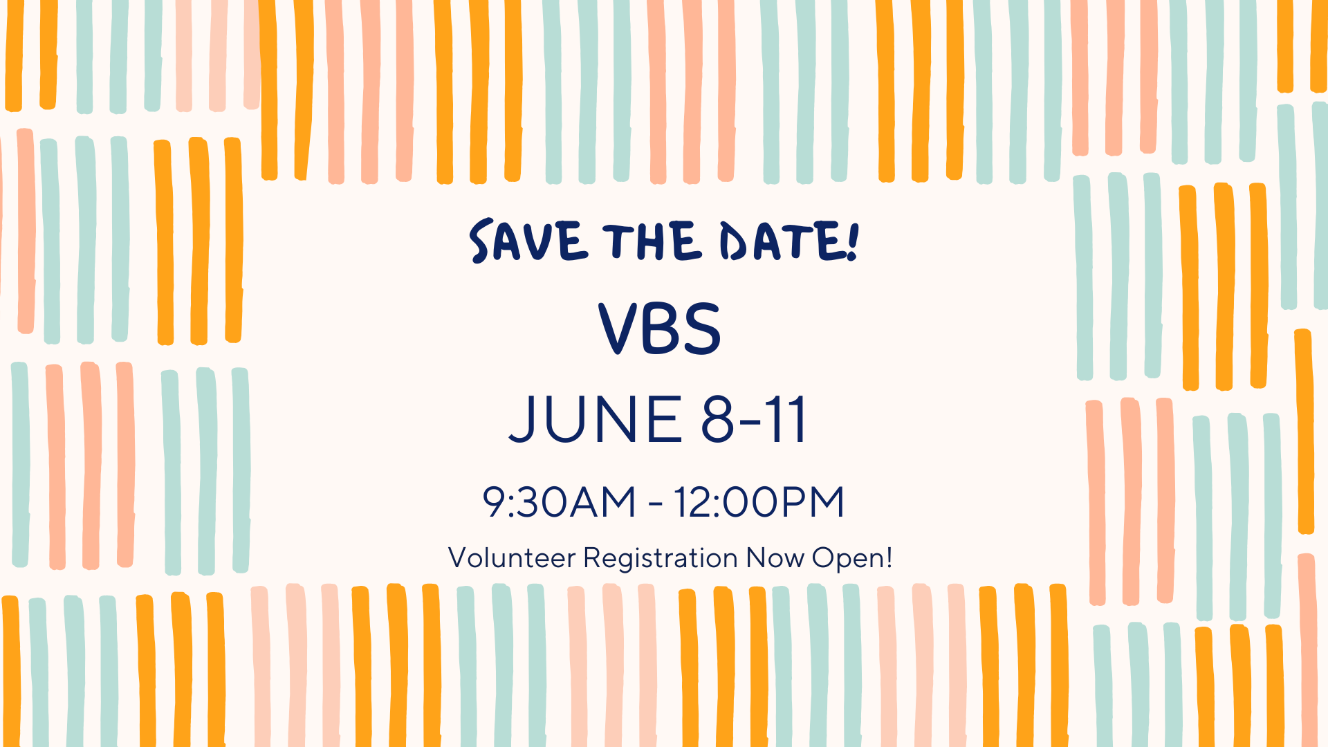 We are in need of volunteers for VBS this year! VBS will take place Monday-Thursday of June 8th-11th in the mornings (9:30am-12:00pm). We are in need of helpers in all areas: group leaders, crafts, stories, games, music, meals/food, and set up & clean up.